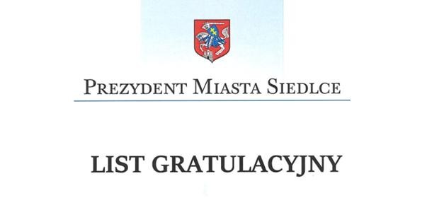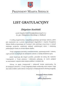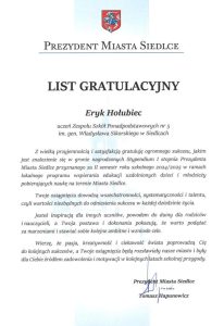 Z radością informujemy, że dwóch uczniów naszej szkoły – Eryk Hołubiec oraz Zbigniew Kosiński – zostało uhonorowanych Listami Gratulacyjnymi podpisanymi przez Tomasza Hapunowicza, Prezydenta Miasta Siedlce.