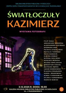 3 grudnia 2025 r. w Galerii Miejskiej Biblioteki Publicznej w Siedlcach odbył się wernisaż wystawy fotograficznej „Światłoczuły Kazimierz”, przygotowanej przez uczniów naszej szkoły. Wydarzenie zgromadziło licznych gości, a zaprezentowane prace wzbudziły ogromne zainteresowanie i podziw.